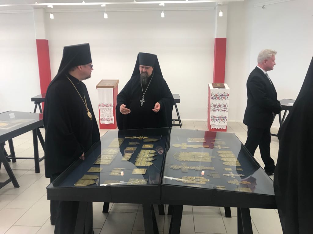 По завершении богослужения епископ Игнатий посетил выставку литых икон Русского Севера, представленных в выставочном зале монастыря. Об иконах гостям рассказал настоятель обители архимандрит Сергий (Райаполви).