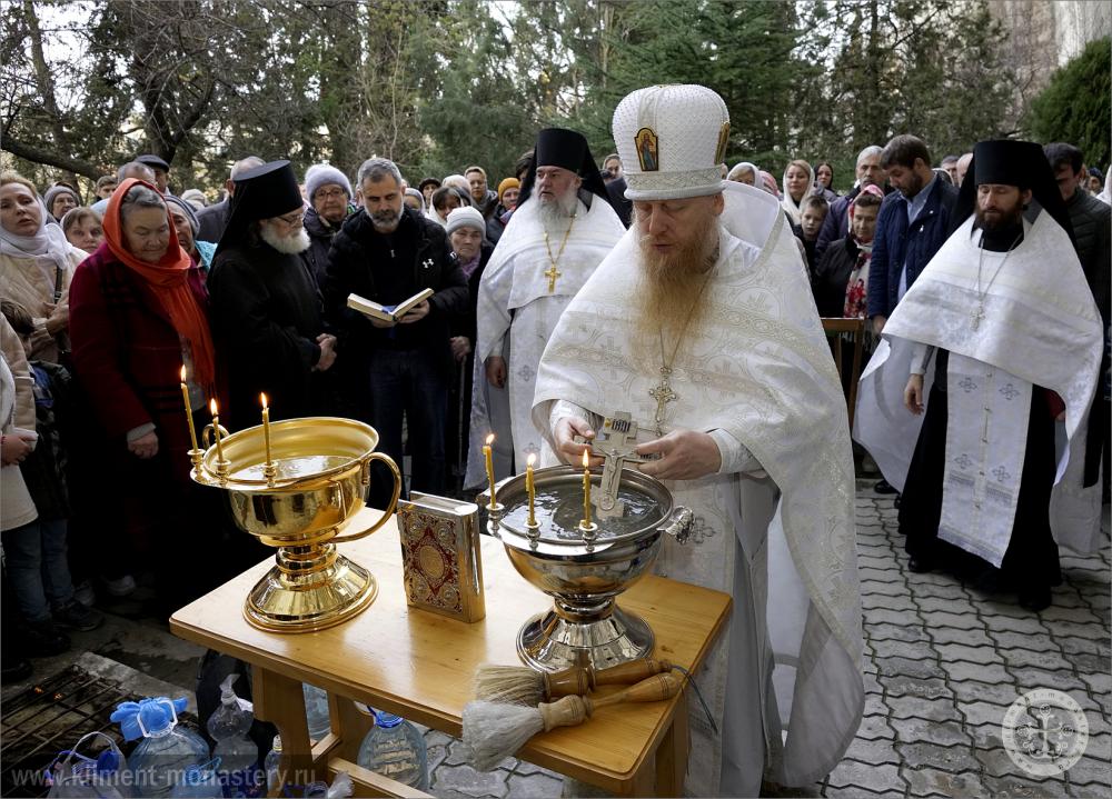 По окончании Литургии клир и богомольцы под звон колоколов с древней Каламиты выдвинулись крестным ходом к пещерам Монастырской скалы, где отец благочинный совершил чин великого освящения воды, по окончании которого насельники монастыря в священном сане окропили всех прихожан и паломников святыми водами великой агиасмы.