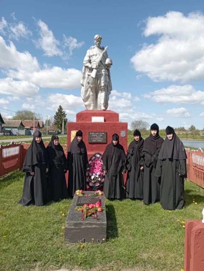Затем, по ежегодной традиции, игумения Архелая (Новикова) с насельницами монастыря, учащиеся воскресной школы и паломники посетили братские захоронения советских воинов в агрогородке Корма Добрушского района. Здесь была совершена лития об упокоении усопших воинов, за веру, Отечество и народ жизнь свою положивших, и всех страдальчески погибших в годы войны.