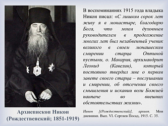В своем выступлении епископ Леонид подытожил сообщения предыдущих докладчиков и рассказал на примере жизненного пути архимандрита Леонида (Кавелина) о формировании его личности и монашеского устроения в результате взаимодействия с преподобным Оптинским старцем Макарием. Также владыка отметил, что сам отец Леонид, сохраняя заветы своего старца, смог повлиять на формирования личности известного иерарха архиепископа Никона (Рождественского).