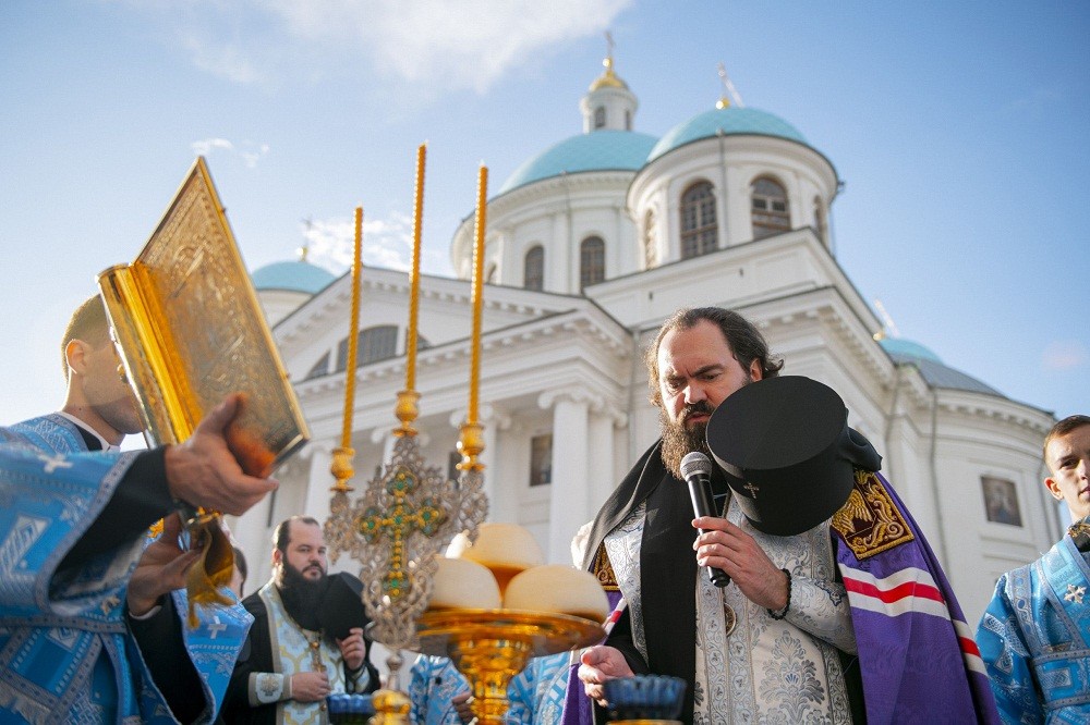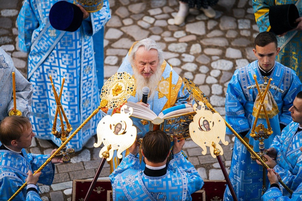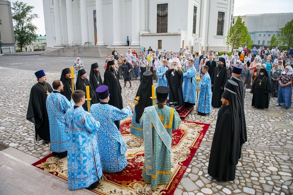 Богослужение совершалось на центральной площади перед собором Казанской иконы Божией Матери на месте явления чудотворного образа Царицы Небесной.