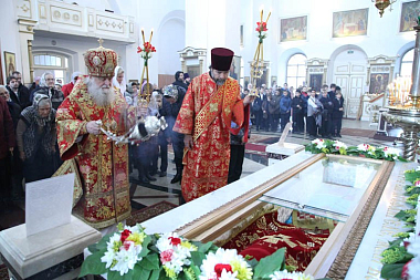 Божественную литургию в Казанском женском монастыре г. Ярославля, где пребывают мощи святителя, совершил митрополит Ярославский и Ростовский Пантелеимон в сослужении епископа Рыбинского и Угличского Вениамина и духовенства Ярославской митрополии.