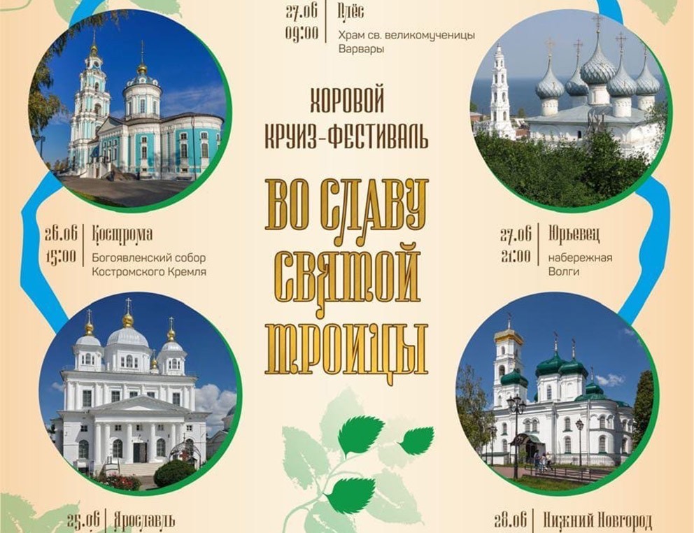 С 25 по 28 июня 2024 года в Ярославле, Костроме, Плёсе, Юрьевце и Нижнем Новгороде пройдет Хоровой круиз-фестиваль «Во славу Святой Троицы», посвященный празднику Святой Троицы.