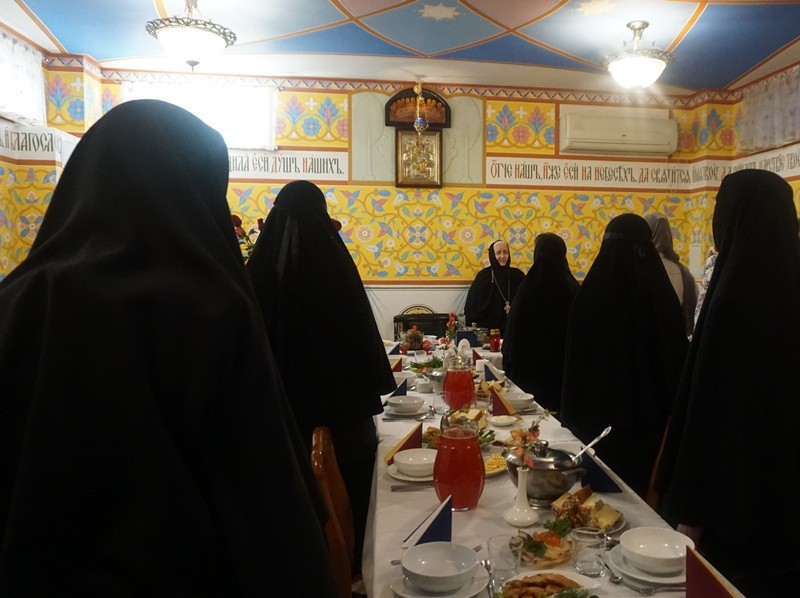 Утром участники богослужения были приглашены в украшенную пасхальными подарками монастырскую трапезную, где раз поздравили друг друга словами «Христос воскресе!». Матушка игумения отметила, что в обители Пасха празднуется 16-й раз и с каждым годом всё лучше, потому что сестры больше молятся, более ответственно относятся к подготовке службы, тщательнее репетируют византийское пение, красивее украшают храм к празднику Пасхи. Сестры исполнили «Благоденствие» матушке Неонилле и песнопение «Ангел вопияше» византийским распевом.