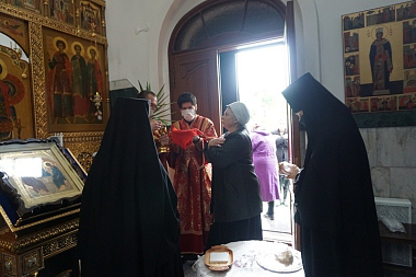 За богослужением молились настоятельница монастыря игумения Неонилла (Кузьмина) с сестрами. Богомольцы-миряне слушали службу по аудиотрансляции во дворе в связи с карантином из-за коронавирусной инфекции. При совершении богослужений в обители соблюдаются все рекомендованные врачами санитарно-гигиенические нормы.