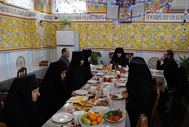 Праздник продолжился в монастырской трапезной, где монашествующие еще раз поздравили друг друга с Рождеством Христовым, после чего сестры спели «Благоденствие» матушке игумении.