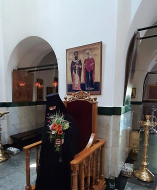 Храмы и монастырский двор были украшены цветущими растениями и колосьями пшеницы, в городе сестры выложили зеленую дорожку от ворот к храму.