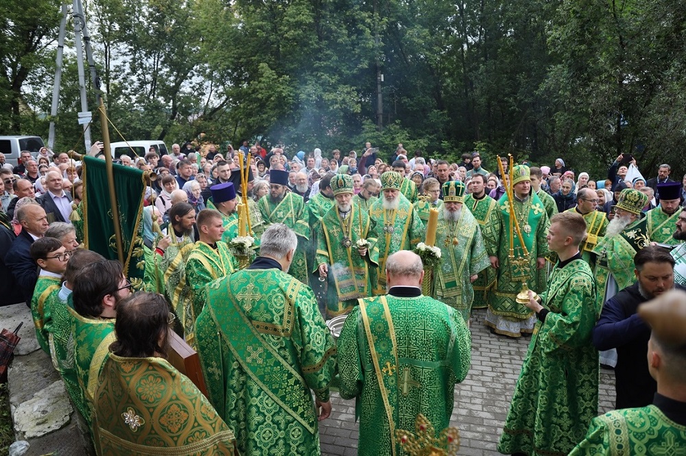 Затем был совершен традиционный крестный ход к святому источнику, где архипастыри совершили чин освящения воды, вознесли молитву праведному Лаврентию Калужскому и окропили молящихся святой водой