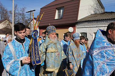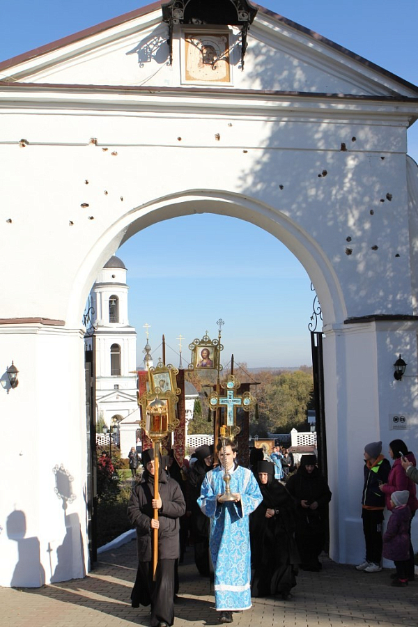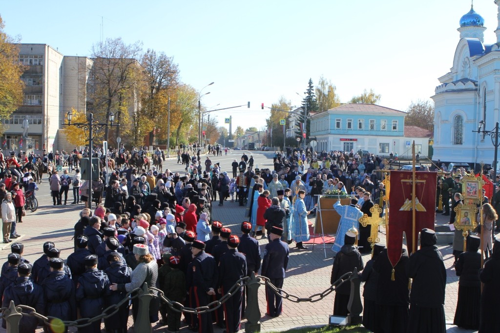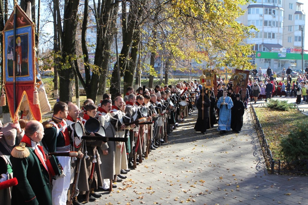 По окончании Литургии крестный ход от Никольского собора выдвинулся с чудотворной Калужской иконой Божией Матери. На площади перед монастырем и по улице Кутузова, где проходил крестный ход, располагались группы реконструкторов в форме 1812 года.