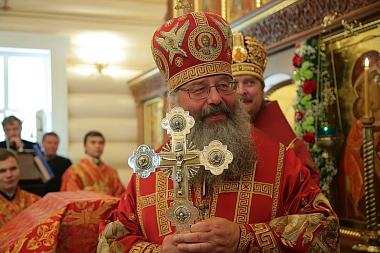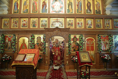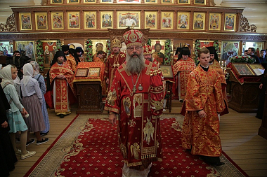 Владыка отметил, что сегодня впервые совершена служба в этом вновь построенном храме. В минувшем году после Царских дней храм пострадал от поджога. Его Высокопреосвященство поведал, что было принято решение возвести на этом святом месте новый храм подобно лучшим образцам российского храмового зодчества, неоднократно воссоздаваемым после пережитых драматических событий.