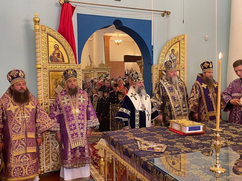 Затем архипастыри в сослужении духовенства совершили Божественную литургию и возглавили крестный ход по территории обители. Также была освящена бронзовая копия Животворящего Креста Господня, установленная близ врат монастыря.