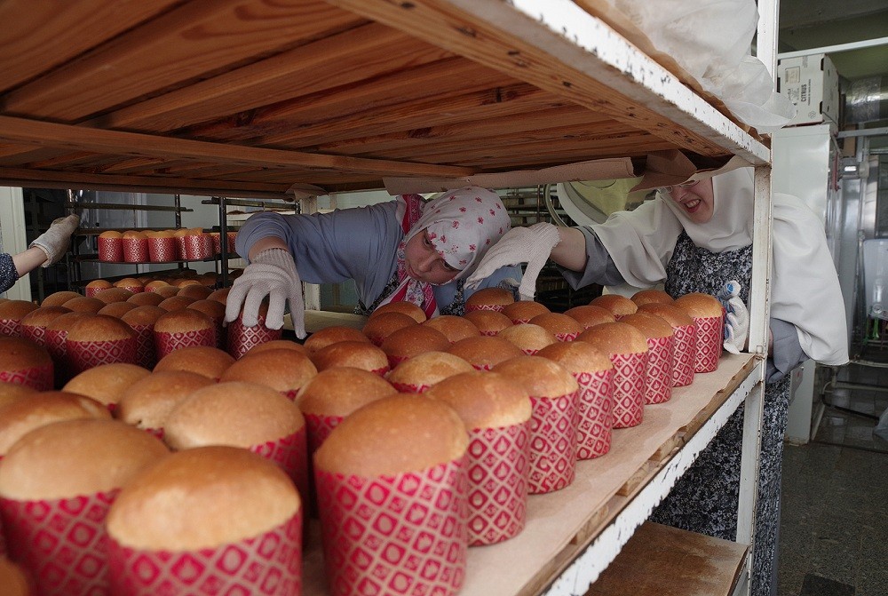 В хлебном цехе в Свято-Троицкого Серафимо-Дивеевского женского монастыря тоже кипит работа – пекут куличи. Об этом сообщается в группе монастыря Вконтакте, где около 80 тысяч подписчиков. До Пасхи в Дивеевской обители предстоит испечь более тысячи куличей для сестер, паломников и гостей, а также около 100 артосов, которые будут находиться у Царских врат храмов обители, скитов, а также дивеевских приходов. Чтобы испечь столь большое количество куличей, сестрам-пекарям помогают насельницы монастыря, которые были заняты на других послушаниях, а также трудники. Кроме того, к украшению куличей привлекают добровольцев.