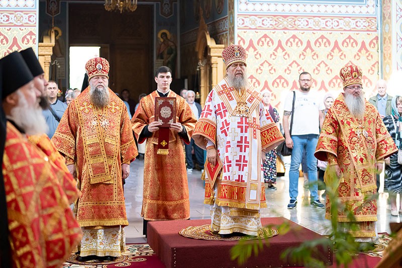 Архипастырь совершил молитву о восстановлении и укреплении мира. Проповедь по запричастном стихе произнес иерей Георгий Сидоров.