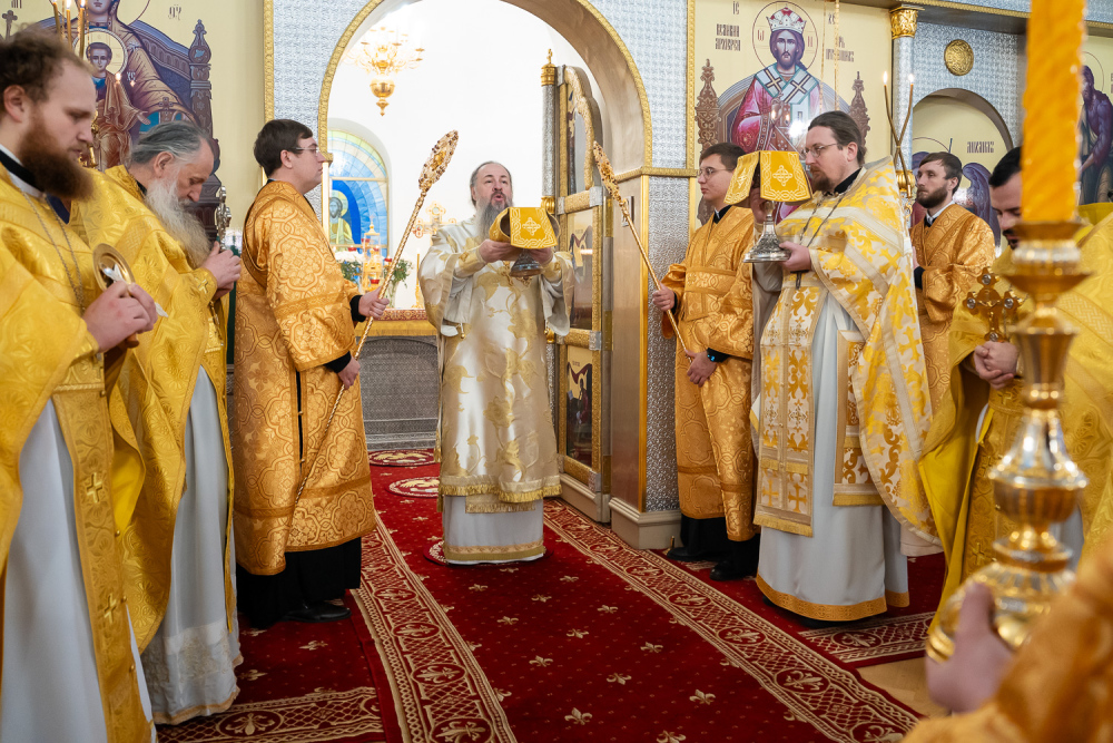 Его Высокопреосвященству сослужили наместник Спасо-Преображенского монастыря игумен Августин (Зайцев), архимандрит Пантелеимон (Бондаренко), иеромонах Ириней (Легошин), иерей Георгий Насонов, диаконы Богдан Яворский, Кирилл Вейго и иеродиакон Иоанникий (Комиссаров).