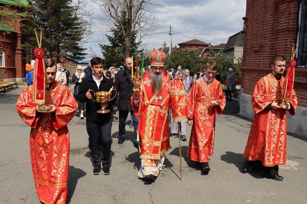 По отпусте Литургии епископ Иннокентий возглавил пасхальный крестный ход вокруг храма, по окончании которого было совершено славление святым женам-мироносицам.