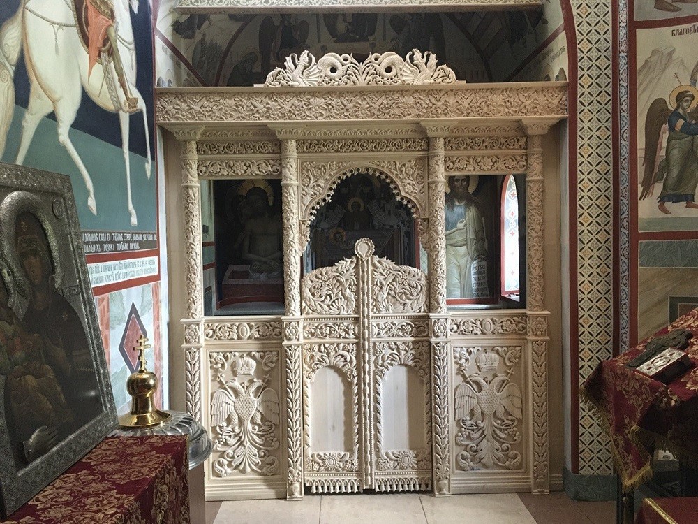 Мастера на нижних щитах вырезали герб Византии с двухглавыми орлами, а также установили низкие царские врата, традиционно распространенные на Балканах. Верх преграды увенчан двумя драконами, на которых в будущем установят резной Крест.