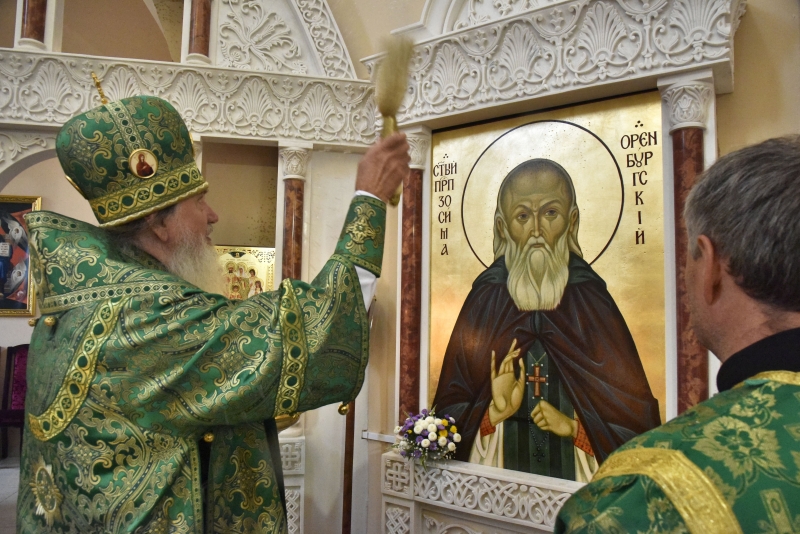Затем владыка окропил новый иконостас храма и святые образы небесного покровителя храма святителя Николая Чудотворца и основателя монастыря преподобного Зосимы Оренбургского.