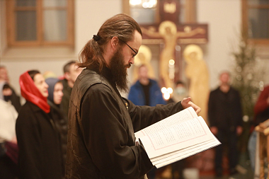 Божественная литургия началась в полночь. Торжественное богослужение возглавил настоятель Николо-Берлюковской пустыни игумен Евмений (Лагутин) в сослужении братии обители в священном сане.