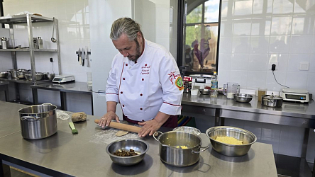Увлекательный мастер-класс для студенток Первого православного колледжа при Николо-Сольбинском женском монастыре провел знаменитый шеф-повар Максим Сырников, его ассистентом был коллега из Новосибирска Эдуард Колчинцев. Под руководством профессионалов девочки научились готовить целых три старинных блюда русской кухни: калью, калитки и кундюмы.