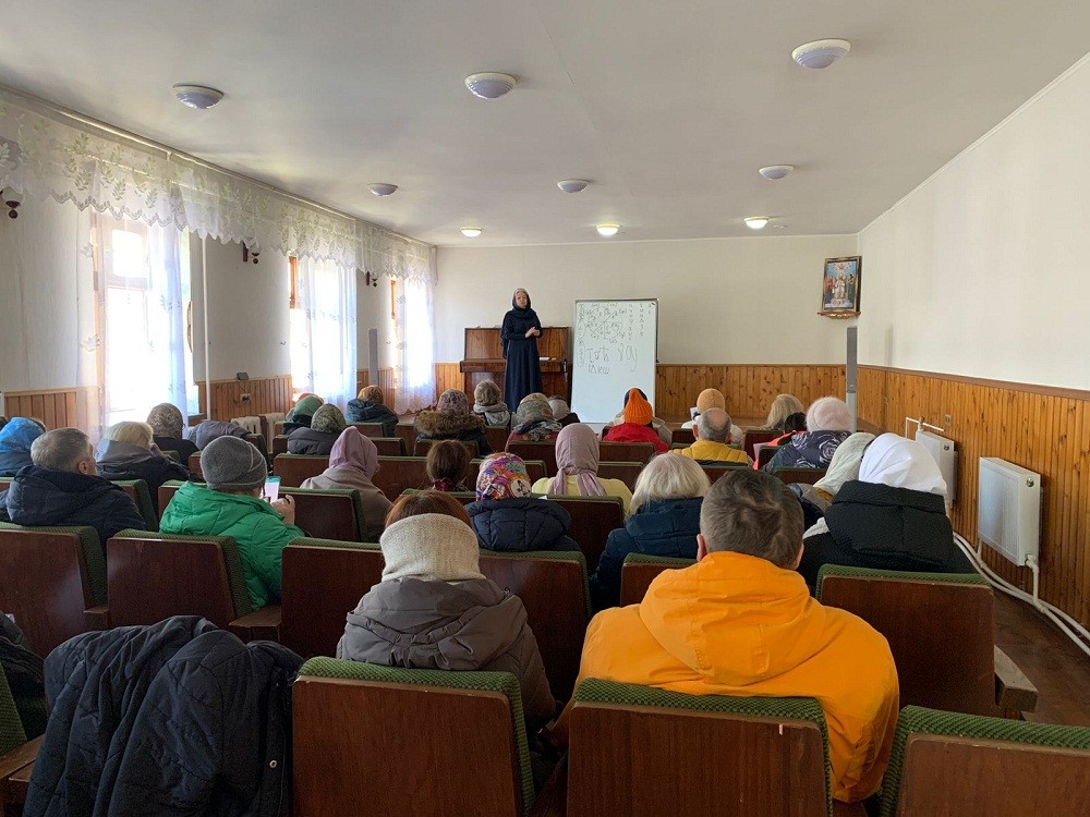 Преподаватель Переславской православной гимназии Вера Геннадьевна познакомила гостей обители с церковнославянским алфавитом, рассказала об особенностях написания забытых нами букв и их былом звучании. Слушатели узнали, как читать сокращения, и почему монотонное чтение «Отче наш» более предпочтительно, чем выразительное.