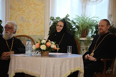 Настоятельница Николо-Сольбинского монастыря, директор школы и колледжа «Добрая школа на Сольбе» игумения Еротиида (Гажу) поздравила девочек с окончанием учебы: