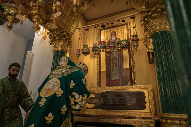 Собравшиеся в храме пропели величание преподобному Нилу, архипастырь, священнослужители и молящиеся приложись к его святым мощам.
