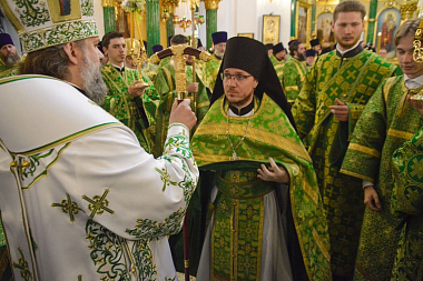 На малом входе в соответствии с определением Священного Синода от 27 мая 2022 года (Журнал № 53) митрополит Амвросий возвел в сан игумена наместника Нило-Столобенской пустыни иеромонаха Гавриила (Баглая) и вручил ему игуменский посох.