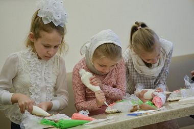 На мастер-классе за украшения пирога отвечали ученики воскресной школы – ребята из начальных классов.