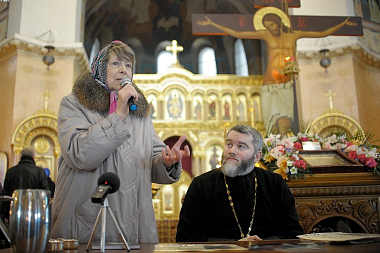 «Храм, где мы с вами сейчас собрались, – поделился отец Георгий, – напоминает Успенский храм Владыки. И символично, что сегодня, в Вербное воскресенье, мы собрались здесь, чтобы приложить пластырь слов митрополита Антония к своему сердцу перед Страстной седмицей». Отец Георгий принес с собой привезенную из лондонского прихода икону Всех британских святых, к которой после встречи смогли приложиться желающие. «Сегодня мы видим, что организуются множество мероприятий, издано множество книг, проходят многотысячные крестные ходы, богослужения транслируются по центральным каналам. Но, мне кажется, простого слова, идущего от сердца, обращенного к каждому, нам сегодня не хватает. И владыка Антоний как скорая помощь в это трудное время. Огромное спасибо организаторам этой встречи, матушке игумении, что монастырь вот так, бесплатно, раздает тот хлеб насущный, который нам очень необходим».
