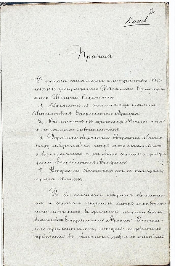 Правило 17. Все сестры должны содержать себя в таком расположении, чтобы, услыша от начальницы назначение какого послушания или предлагаемый совет, немедленно и беспрекословно в точности исполнить, хотя бы то казалось трудным или неприятным.