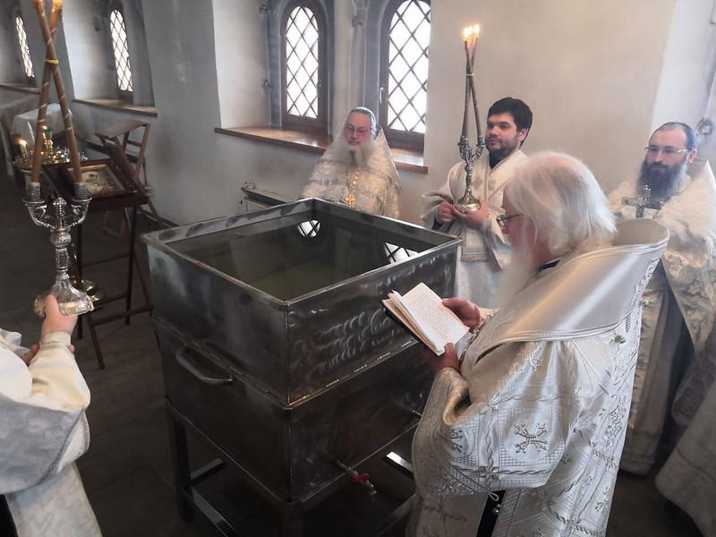 Его Высокопреосвященству сослужили наместник Иверского монастыря иеромонах Антоний (Битьмаев), насельники обители иеромонах Борис (Григорьев), иеромонах Пантелеимон (Шахтахтинский), клирик Софийского собора иерей Николай Полозов.