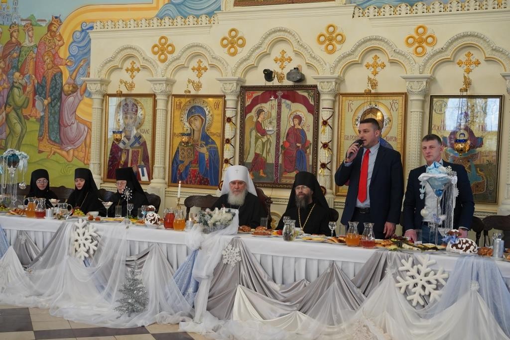 Затем участники праздника направились с пением псалма из Никольского собора к большой трапезной обители, где у могилы схимонахини Марии (Капалиной), мамы владыки Климента, пропели «Вечную память». После чего в большой трапезной монастыря был устроен праздничный обед завершившийся Рождественским представлением, которое подготовили воспитанницы детского православного пансиона «Отрада». Рождественские «волхвы», «северный олень», «белые медведи», и другие сказочные персонажи радовали зрителей своими танцами и песнями. Закружившиеся в хороводе русские красавицы в снежно-серебристых шубах привели в зал Деда Мороза и Снегурочку, которые поздравили всех с Рождеством и Новым Годом и преподнесли митрополиту Клименту и епископу Леониду подарки от настоятельницы Свято-Никольского Черноостровского монастыря игумении Николаи (Ильиной).