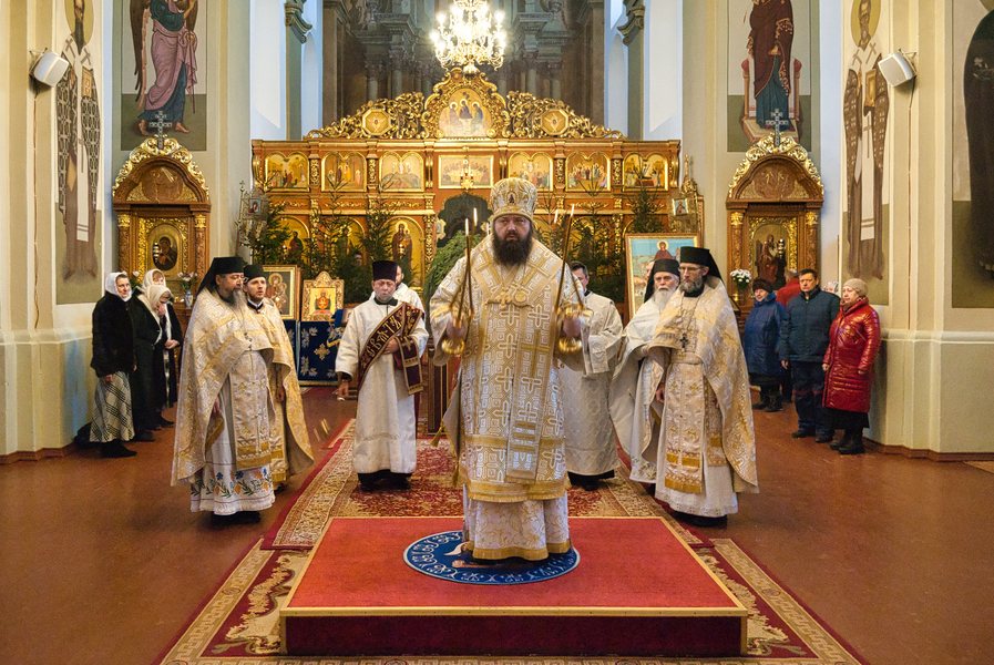 По запричастном стихе протодиакон Георгий Росляков огласил Рождественское послание епископа Борисовского и Марьиногорского Амвросия к клиру и мирянам Борисовской епархии.