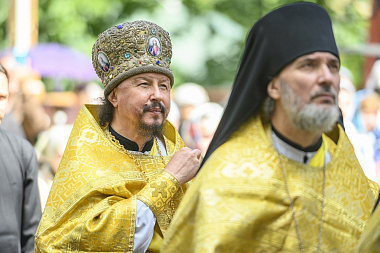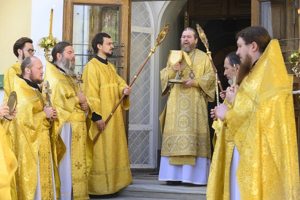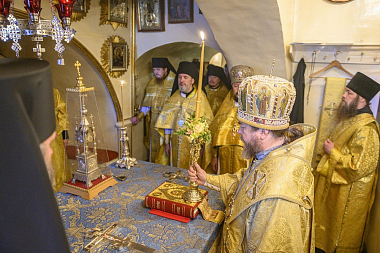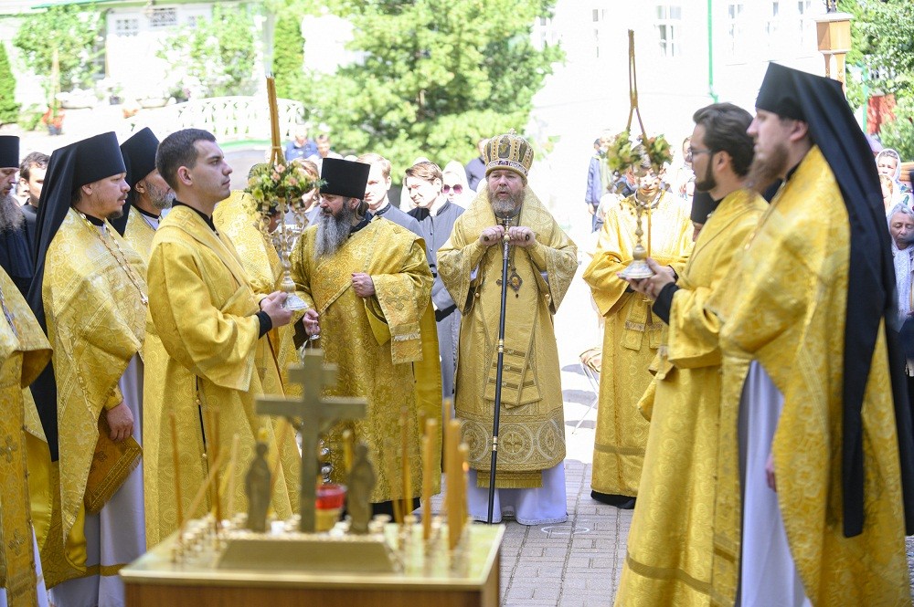 Его Высокопреосвященству сослужили: иеромонах Прохор (Андрейчук), благочинный Псково-Печерской обители, с братией в священном сане.