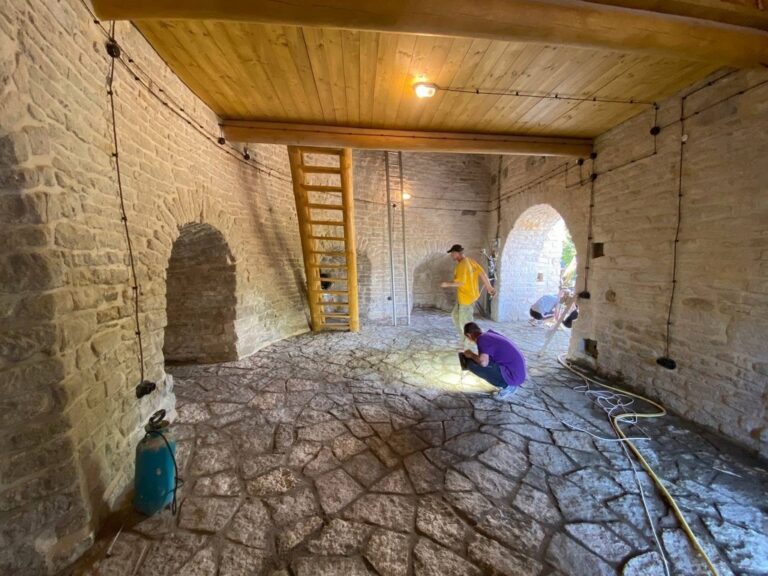 В настоящее время выполняется устройство каменного пола и заполнение швов на стенах первого яруса; монтируется электропроводка, устанавливаются осветительные приборы; со стороны фасадов проводится вертикальная гидроизоляция стен фундамента. Чуть ранее было выполнено уплотнение песчаного основания под отмостку и устройство контура заземления.