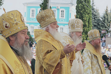 Затем Высокопреосвященнейший владыка Арсений поздравил Преосвященных архиереев, духовенство и многочисленных богомольцев с днем памяти небесного покровителя Задонского монастыря и всей Липецкой земли.