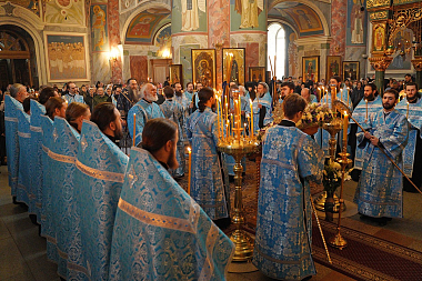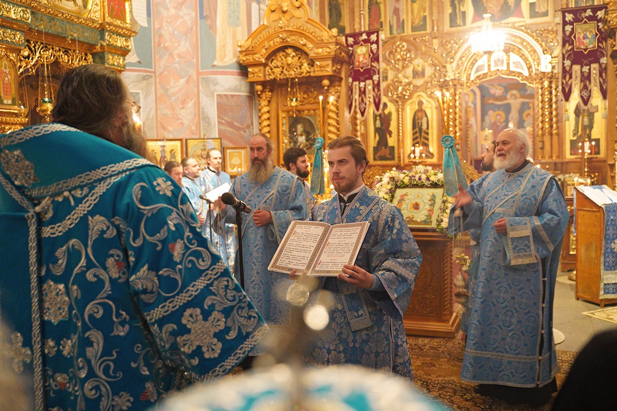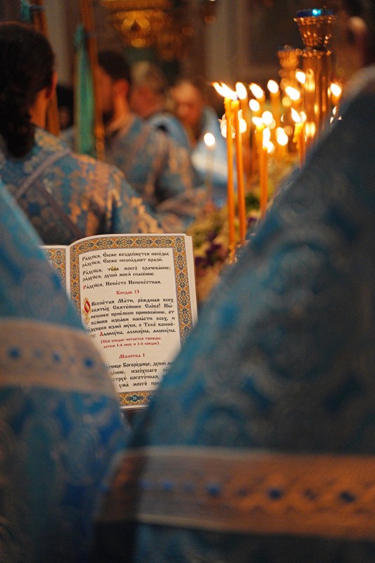 На каждое чтение акафиста открывались Царские врата и духовенство согласно уставу выходило из алтаря четыре раза под пение кондака «Взбранной Воеводе победительная». Высокопреосвященнейший владыка Георгий каждый раз при этом менял облачения голубого цвета, тем самым подчеркивая торжественность совершаемого моления.