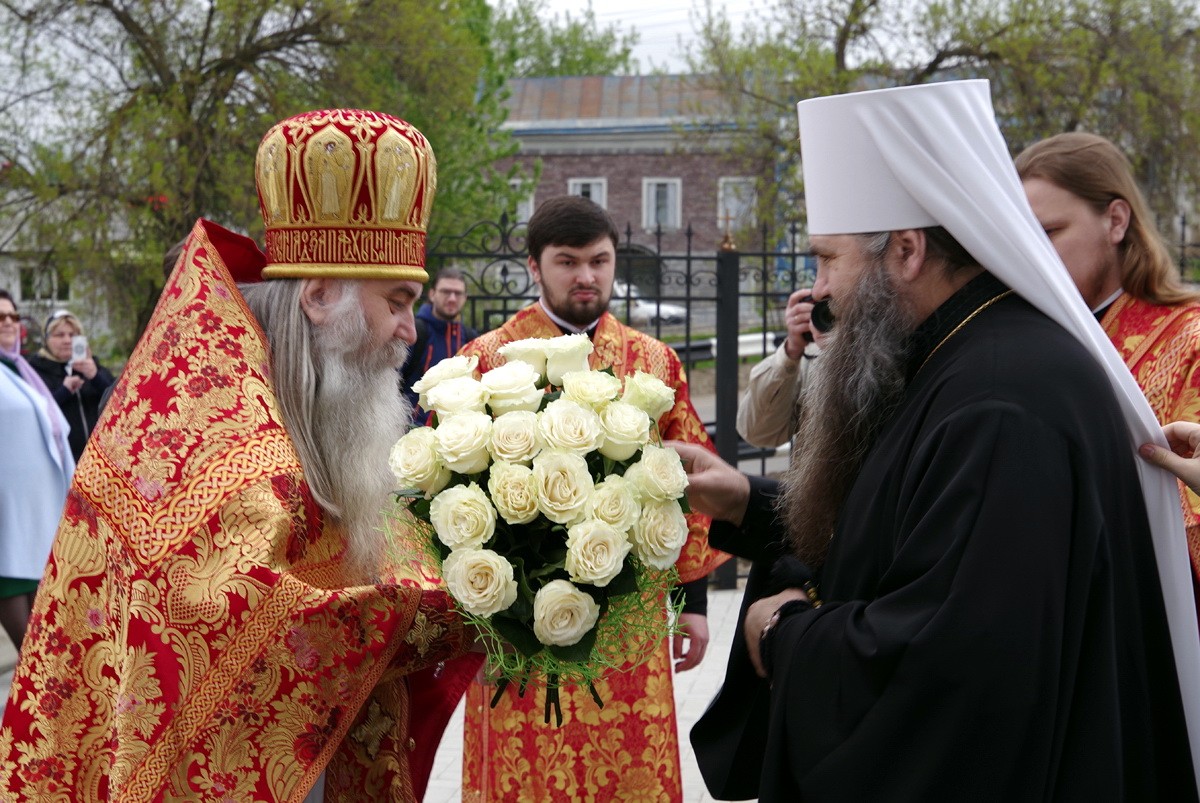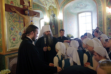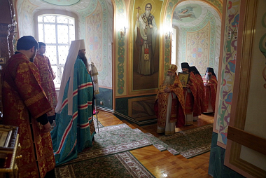 По окончании Литургии архимандрит Тихон поблагодарил управляющего Нижегородской епархией за совершенное богослужение и архипастырское попечение об арзамасских обителях и храмах и преподнес Владыке в дар образ святителя Николая Чудотворца.
