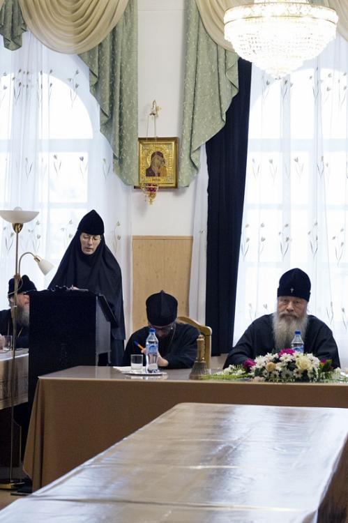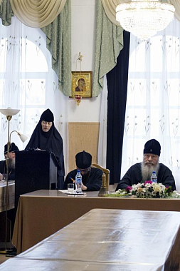 Затем слово было предоставлено насельнице Боголюбского монастыря монахине Евпраксии (Давидовской), которая выступила с докладом «Война и монашество – путь высшего подвига».