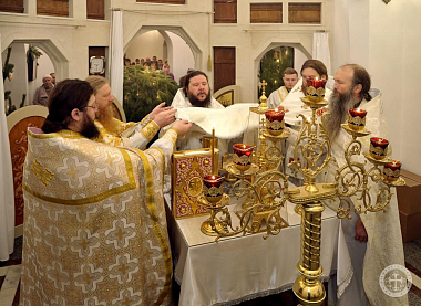 В полночь колокола пещерных храмов возгласили начало ранней Божественной литургии, которую в древней Свято-Климентовской церкви возглавил насельник обители иеромонах Иларион (Чистяков) при большом стечении богомольцев.