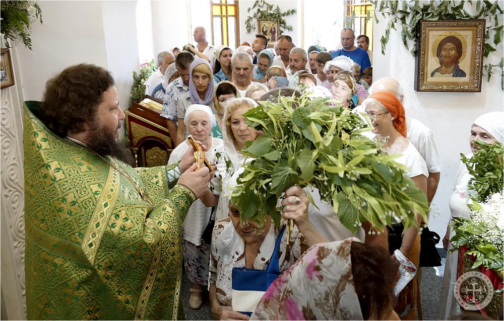 По отпусте во время целования креста отец наместник освятил традиционные троицкие березовые ветки и цветы.
