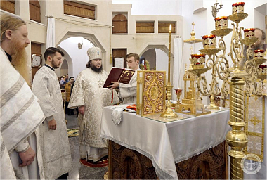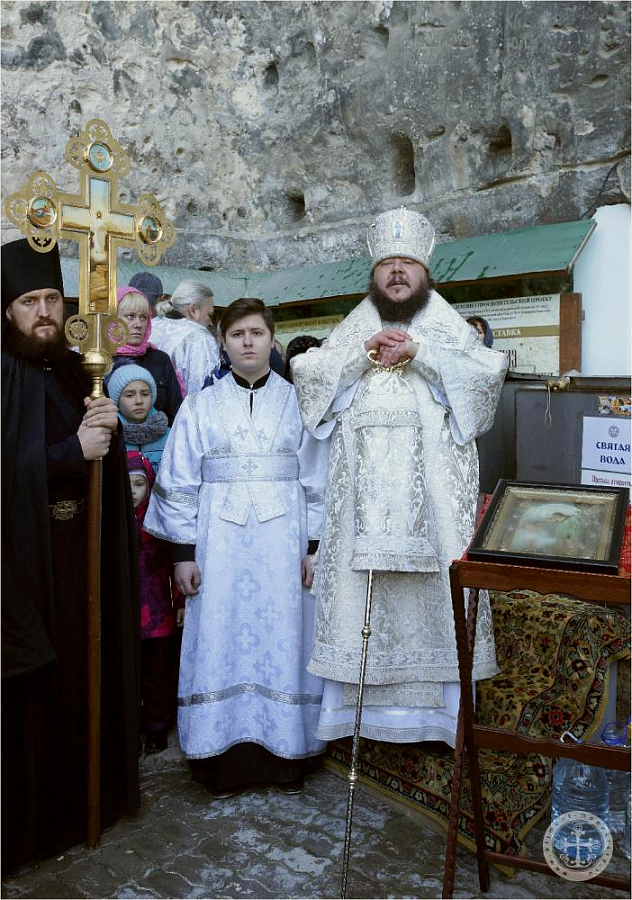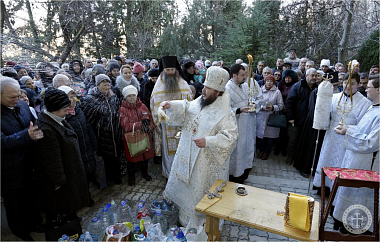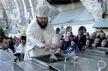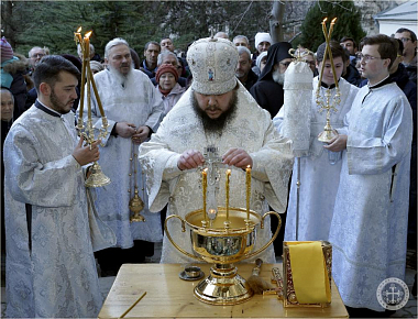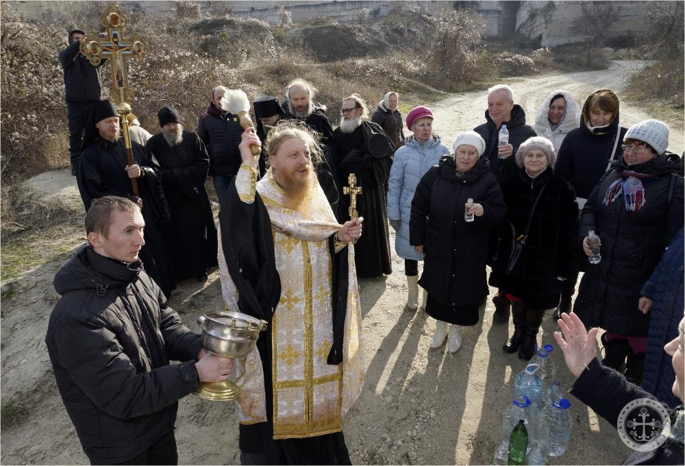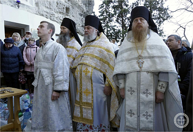 По окончании богослужения Преосвященным владыкой Каллиником на монастырском дворе у древних пещер был совершен чин освящения великой агиасмы в сослужении насельников Инкерманского монастыря в священном сане.