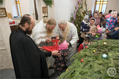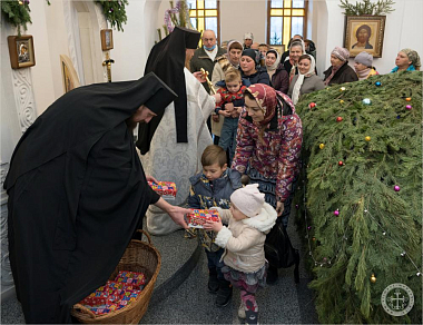 По окончании Литургии всем маленьким прихожанам обители по благословению наместника Свято-Климентовского монастыря епископа Бахчисарайского Каллиника были вручены рождественские подарки.