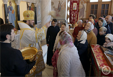 По окончании Литургии владыка Каллиник произнёс проповедь, и на целовании креста окропил всех собравшихся святой водой.