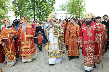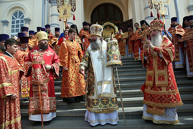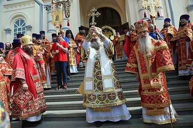 По окончании Литургии был совершен крестный ход вокруг Крестовоздвиженского собора монастыря.