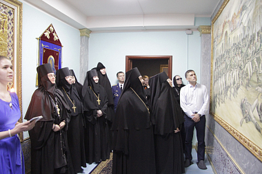 Затем гостей монастыря ждала экскурсия по постоянной экспозиции интерактивного музея «Победоносное Малоярославецкое сражение в Отечественной войне 1812 года», которую провели волонтеры проекта студентки Центра православных медиа РГСУ при Свято-Никольском Черноостровском женском монастыре Анастасия и Кристина Сарвилины.
