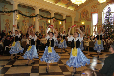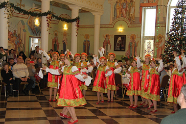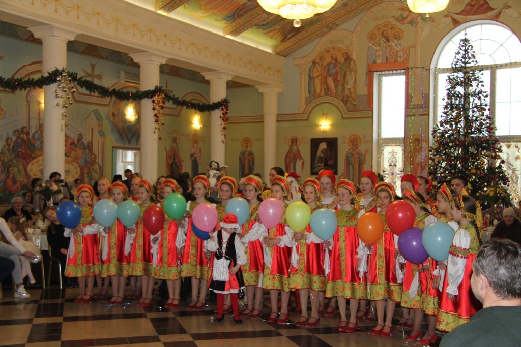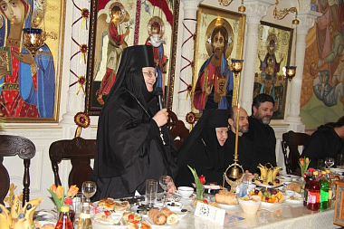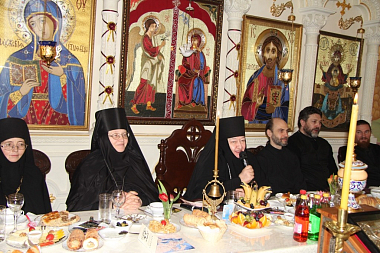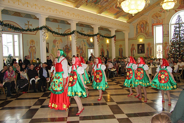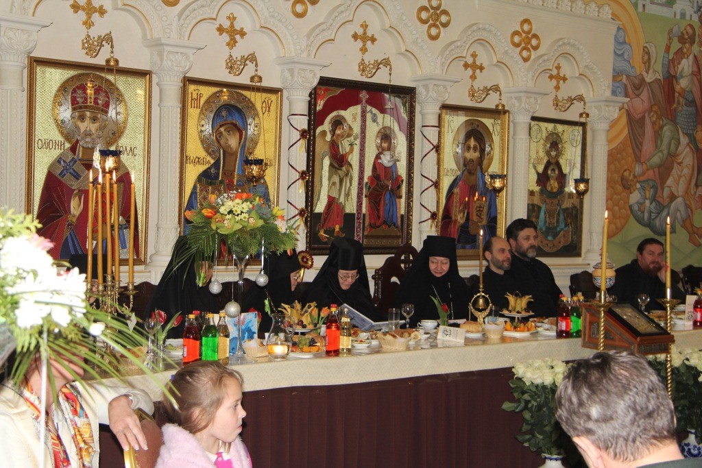 По окончании Литургии и молебна с акафистом перед иконой Божией Матери «Отрада и Утешение» собравшихся на праздник гостей пригласили в большую трапезную монастыря на праздничную трапезу и представление.