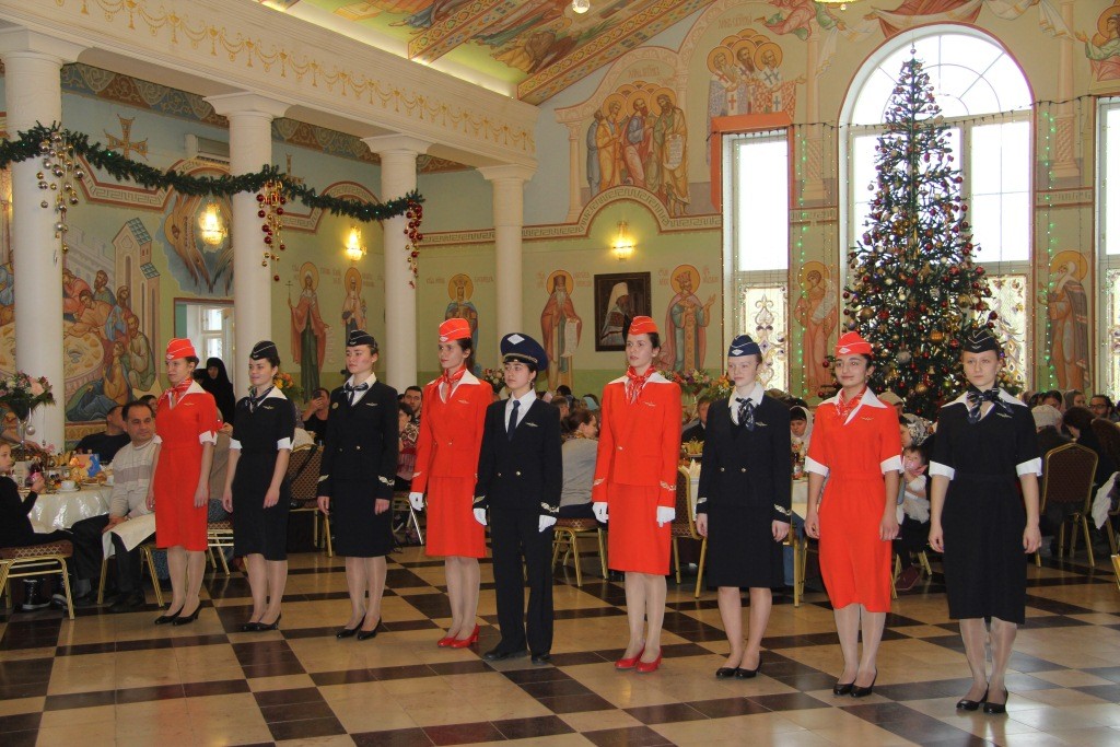 После молитв и звонка на трапезу в центр зала вышли самые настоящие бортпроводницы и капитан авиалайнера «Отрада», «уже 25 лет кругосветно путешествующий по всему миру», и вполне профессионально по-русски и по-английски сделали объявление о маршруте путешествия и мерах безопасности во время такого особенного полета.