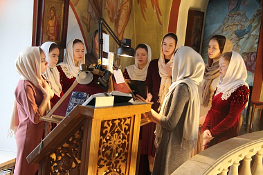 Праздничное воскресное всенощное бдение накануне праздника, во время которого воспитанницы пансиона «Отрада» исполняли обязанности не только певчих на клиросе, но и регентов, уставщиков, церковниц, чтецов, в том числе при чтении шестопсалмия и паремий, читали помянники, помогали алтарничать: выносить свечи, подавать кадило, держать освященное масло во время помазания на полиелее. Также девочки помогали и во время праздничной Божественной литургии в сам день праздника.