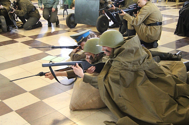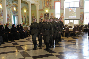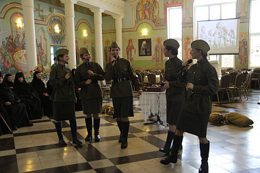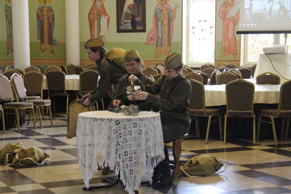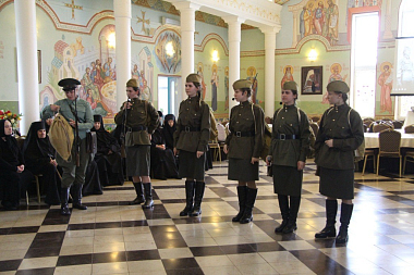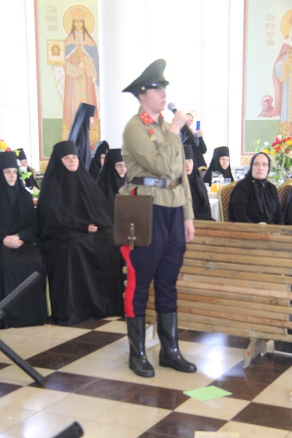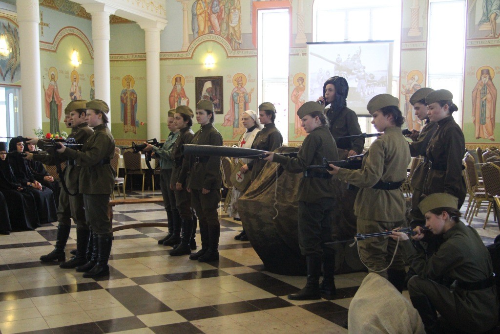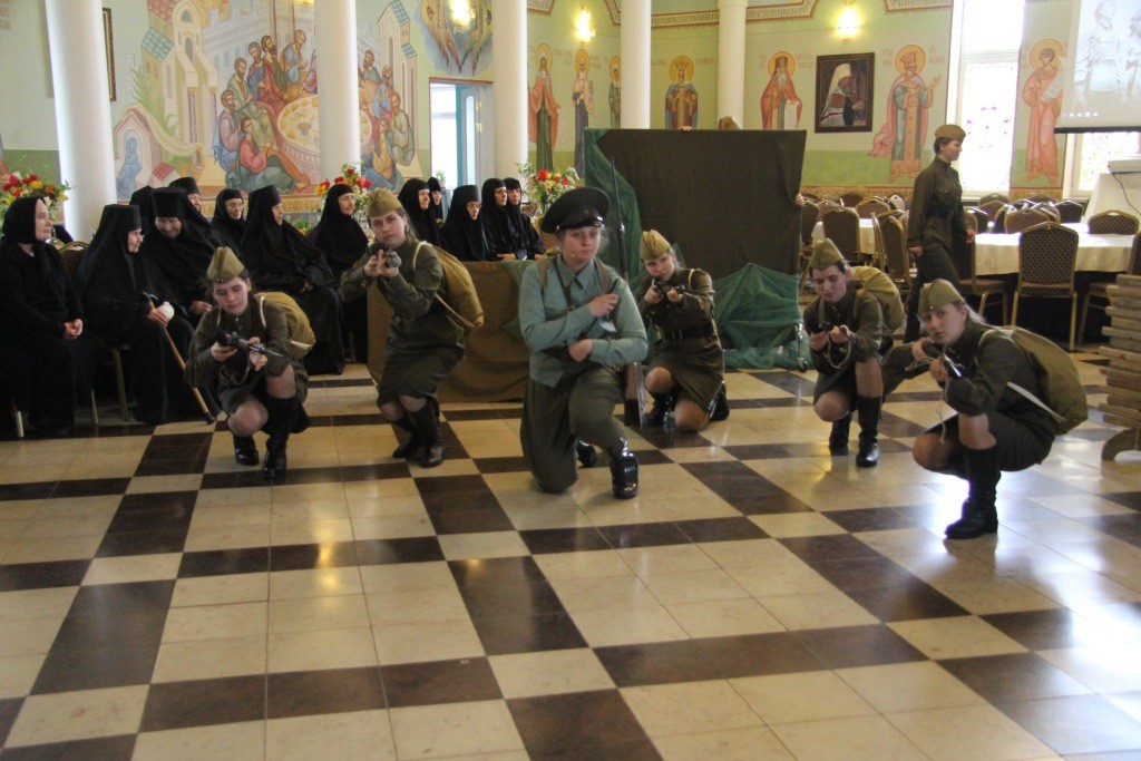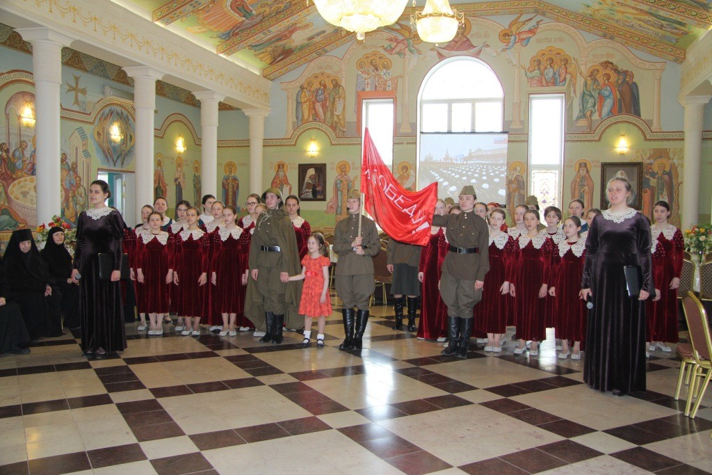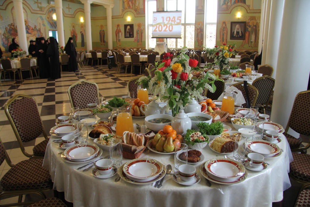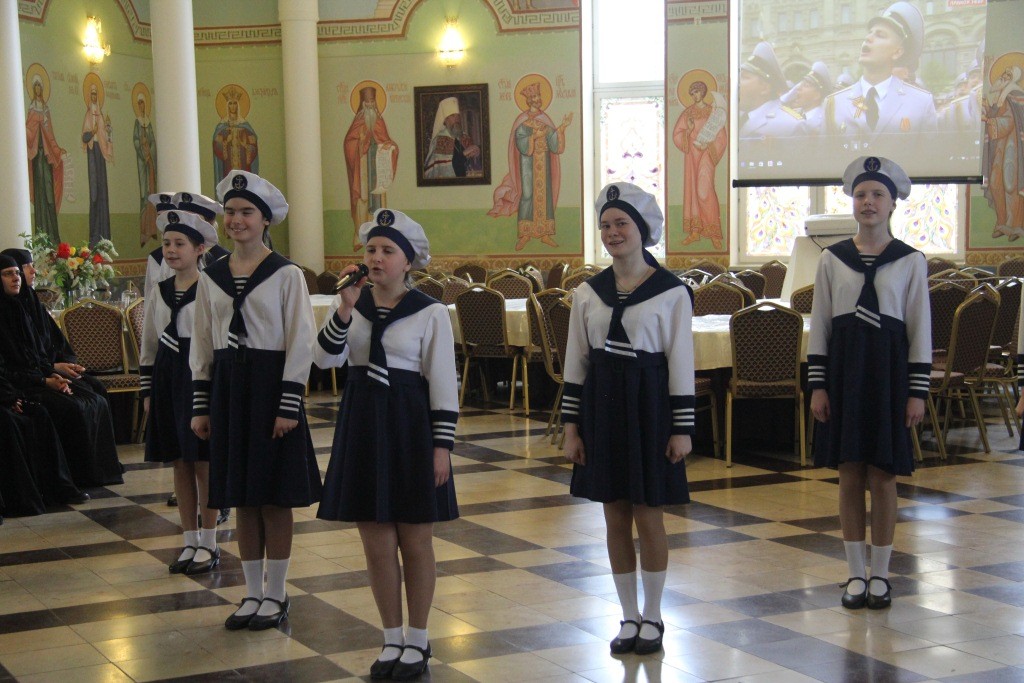Затем праздник продолжился в большой трапезной обители. По завершении праздничного обеда под песни военных лет, которые по своему смыслу тогда стали проповедью той любви, «аще кто положит душу свою за други своя» (Ин. 15:13) и, можно сказать, духовным словом для всей страны, был представлен концерт-спектакль, посвященный 75-летнему юбилею Великой Победы.